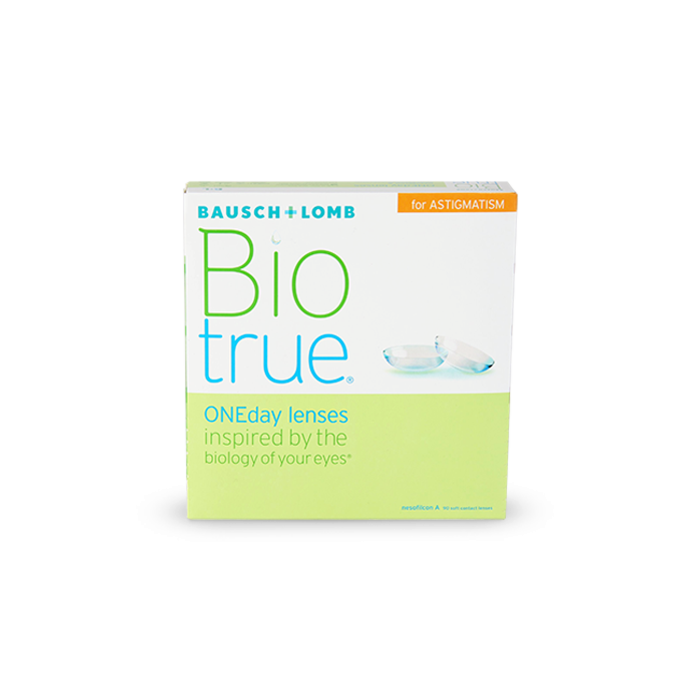 Biotrue ONEday for Astigmatism 90 pack contact lenses are made from a lens material that resists deposit build-up and makes these contact lenses easy to handle for toric lens wearers. These lenses are designed to keep your eyes feeling comfortable throughout the day and seeing clearly at all distances. Biotrue ONEday for Astigmatism 90 pack lenses are comfortable to wear and a great alternative to your glasses. Manufactured by Bausch & Lomb.  Available in 90 & 30 packs.